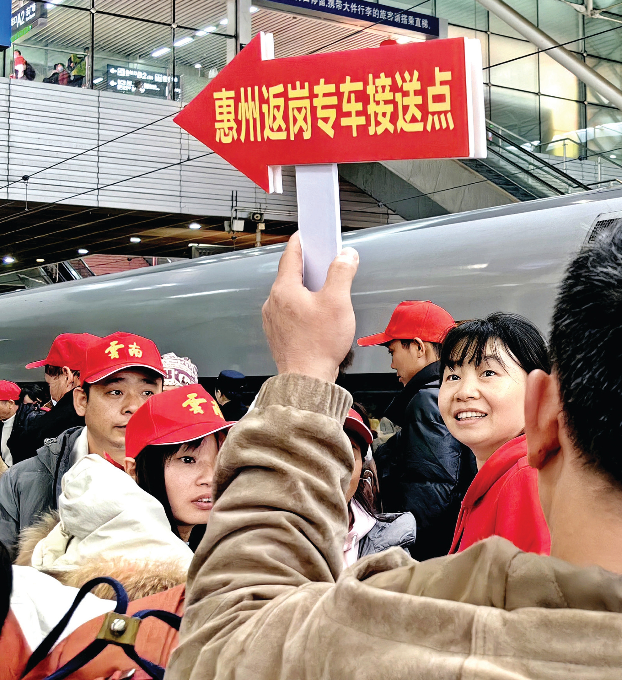 惠州市人社部門工作人員在深圳北高鐵站迎接返惠務工人員。 惠州日報記者李松權 實習生鄭昊陽 攝