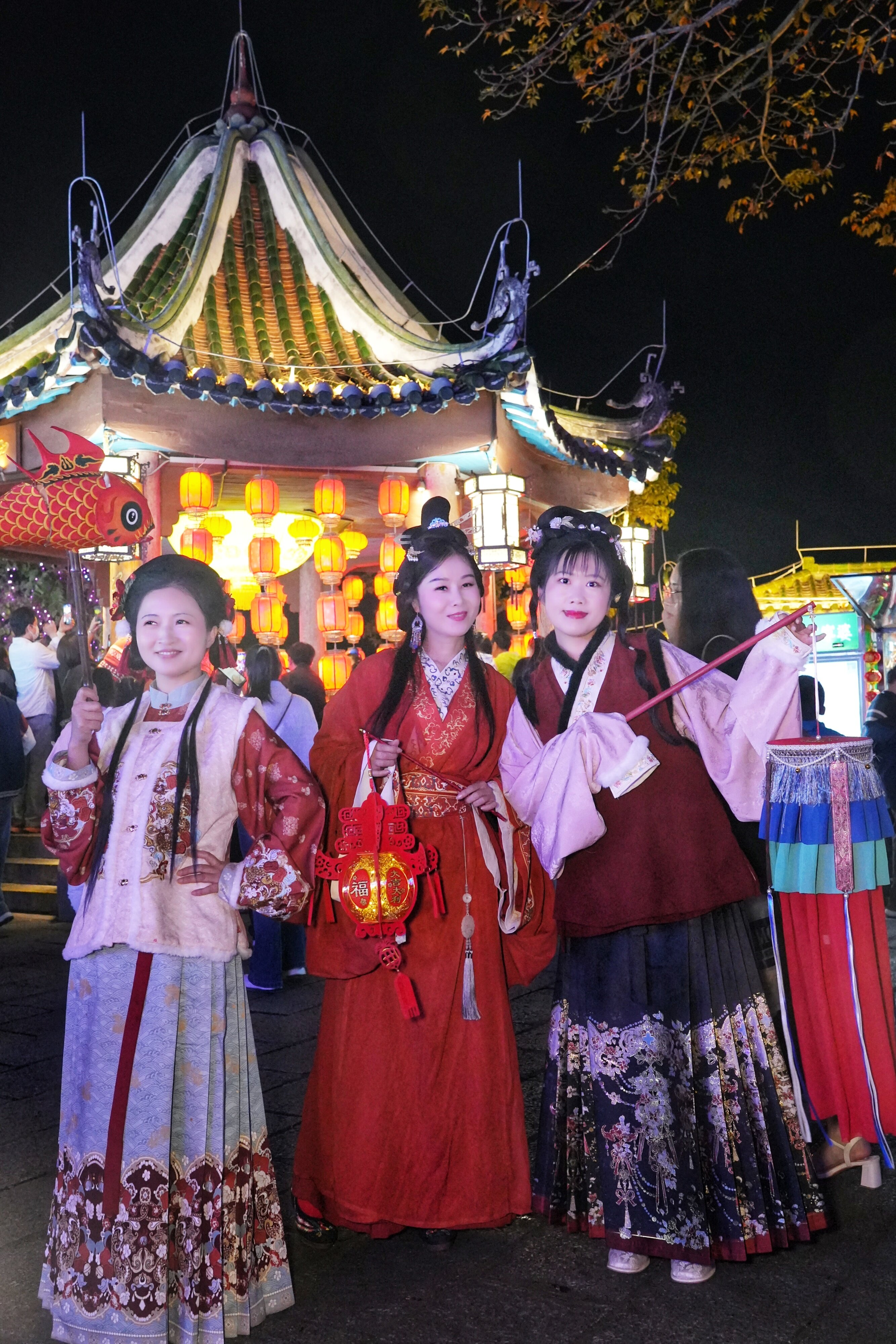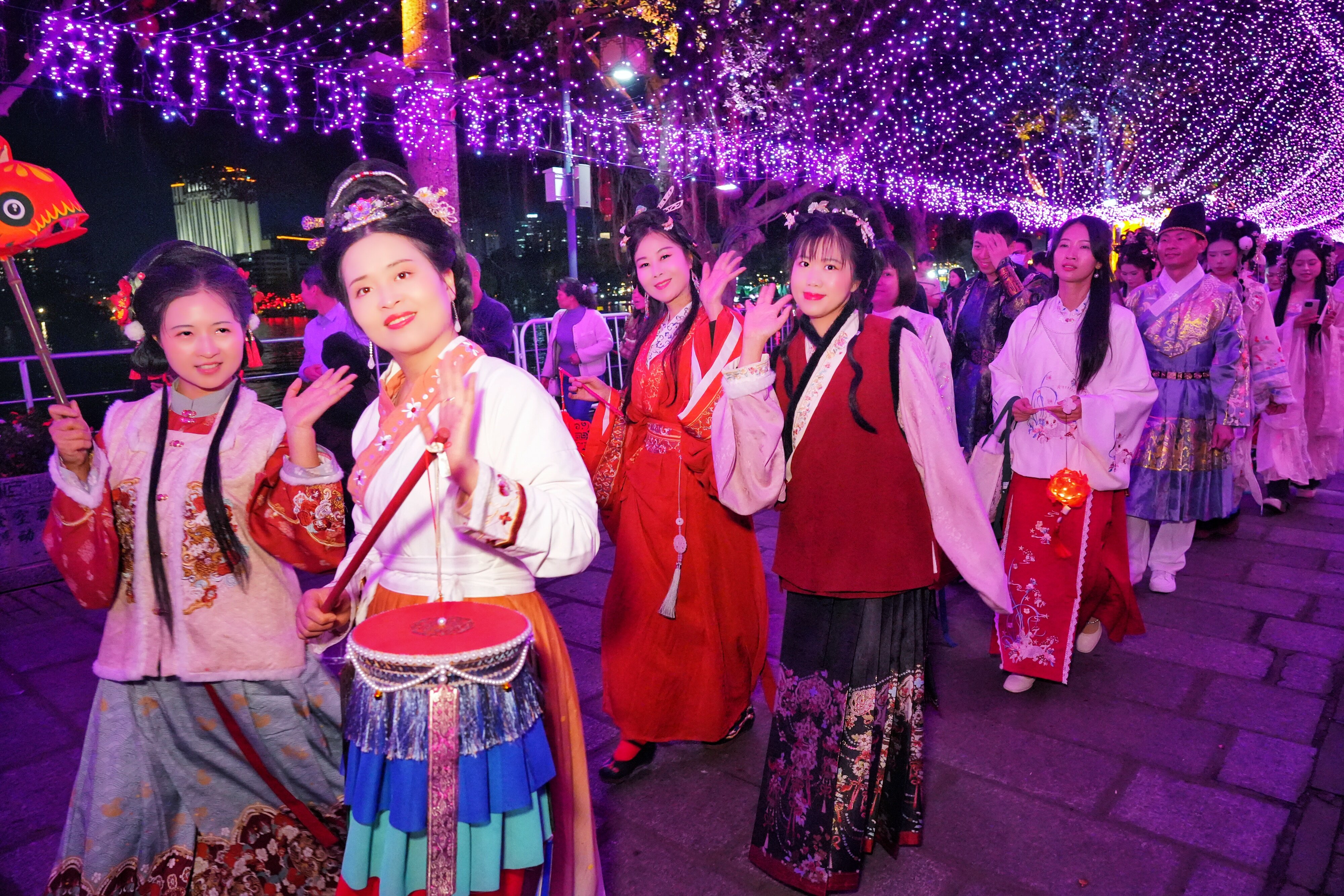 忽然,一陣悠揚(yáng)的絲竹聲傳來(lái),循聲望去,只見(jiàn)一群漢服小姐姐正舉著花燈巡游。