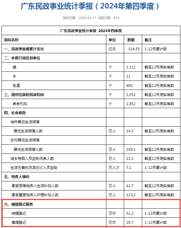 據(jù)廣東民政事業(yè)統(tǒng)計(jì)季報(bào)(2024年第四季度),2024年廣東結(jié)婚登記數(shù)為51.2萬對(duì),較2023年(63.2萬對(duì))減少約19.0%;離婚登記20.7萬對(duì),較2023年(19.1萬對(duì))有所上漲。