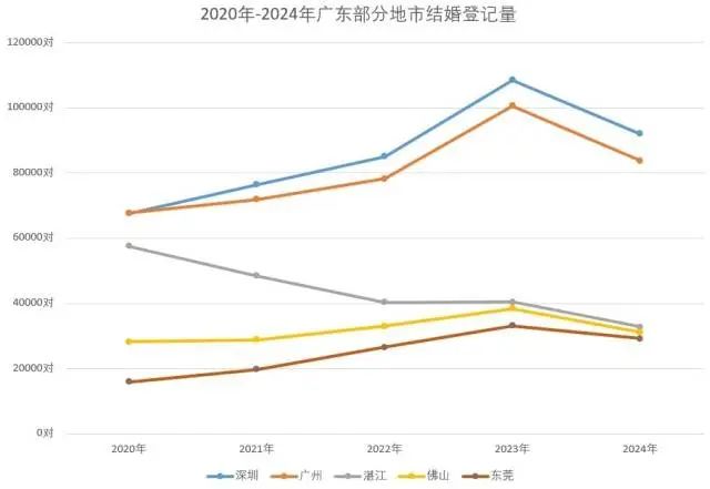 2024年廣東結(jié)婚登記量前五的城市依次為:深圳(91926對(duì))、廣州(83712對(duì))、湛江(32737對(duì))、佛山(31121對(duì))、東莞(29208對(duì))。這5座城市的結(jié)婚登記呈現(xiàn)兩種不同的趨勢(shì)。