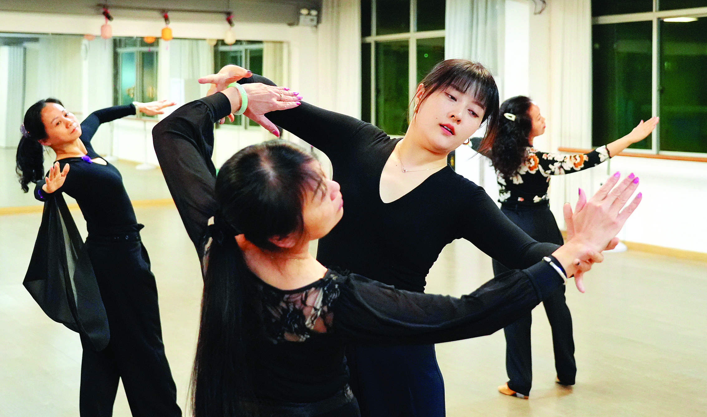 作為藝術(shù)性高、技巧性強(qiáng)的競(jìng)技性舞蹈,國(guó)標(biāo)舞被很多國(guó)家納入體育競(jìng)技范疇。“相較于普通的健身類(lèi)廣場(chǎng)舞、交誼舞,競(jìng)技類(lèi)國(guó)標(biāo)舞有規(guī)范的動(dòng)作、套路,會(huì)根據(jù)動(dòng)作名稱(chēng)及技術(shù)展示來(lái)打分,學(xué)起來(lái)有一定難度。”黃嘉文說(shuō)。在教學(xué)過(guò)程中,她會(huì)先指導(dǎo)學(xué)員每天循環(huán)練習(xí)最基礎(chǔ)的架形框架,慢慢過(guò)渡到一些簡(jiǎn)單的動(dòng)作和組合、搭配音樂(lè),教授雙人配合的課程。每一個(gè)動(dòng)作細(xì)節(jié),她都反復(fù)示范、反復(fù)糾正。