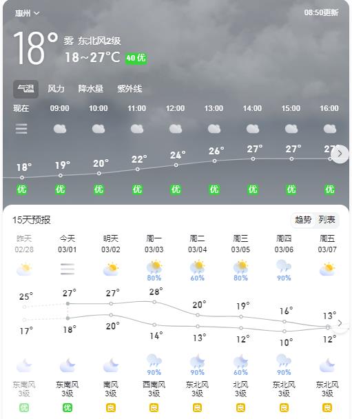 據(jù)惠州市氣象臺預(yù)計(jì),3月1日-3日白天我市天氣暖濕,早晚有(輕)霧,各地伴有不同程度的“回南天”,最低氣溫17~21℃,最高氣溫26~28℃;3日傍晚-4日,受冷空氣影響我市有一次降溫降雨過程,北部有中到大雨局部暴雨,中南部有小到中雨,局地伴有雷電和6~8級短時大風(fēng)等強(qiáng)對流天氣,氣溫14~19℃;5日,陰天,有小雨局部中雨,氣溫13~18℃。
