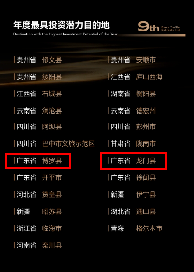 根據(jù)發(fā)布榜單,博羅縣、龍門縣入選第九屆黑松露獎“年度最具投資潛力目的地”,龍門縣愛樹·南昆秘境、花溪雨玉石溫泉民宿和博羅縣璞若山居民宿、慢享欖園度假民宿、浮生六季·望山民宿等5家民宿入選“年度精品民宿榜”。