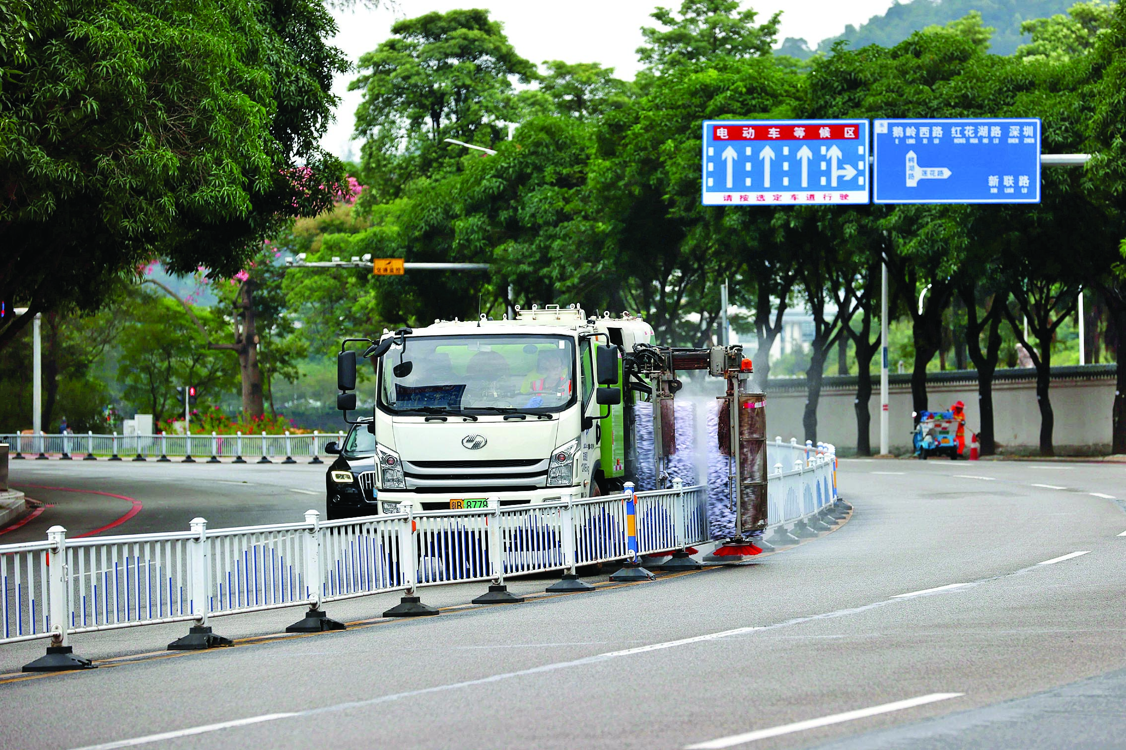 清潔車(chē)在清洗護(hù)欄。惠州日?qǐng)?bào)記者楊建業(yè) 攝