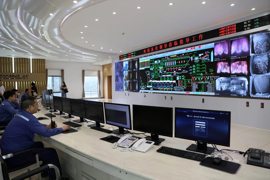 惠州生態(tài)環(huán)境園內(nèi),工作人員在中央控制室監(jiān)控焚燒情況。