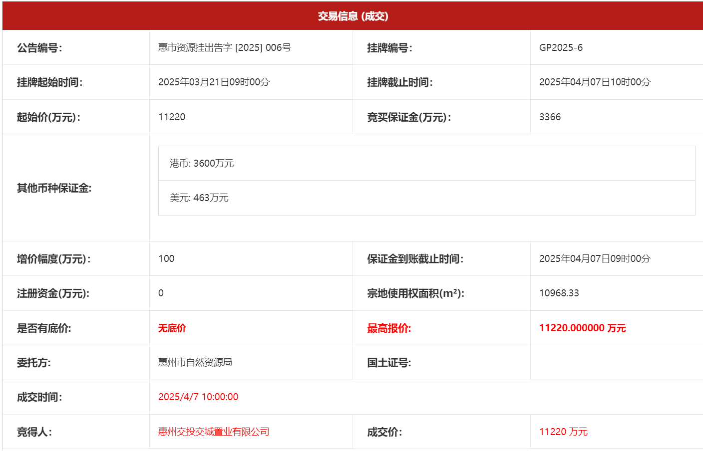 4月7日,惠城區(qū)金山湖片區(qū)JSH-B06-09-3-2-01地塊,被惠州交投交城置業(yè)有限公司以底價1.12億元摘牌,折合樓面價約為5115元/平方米。