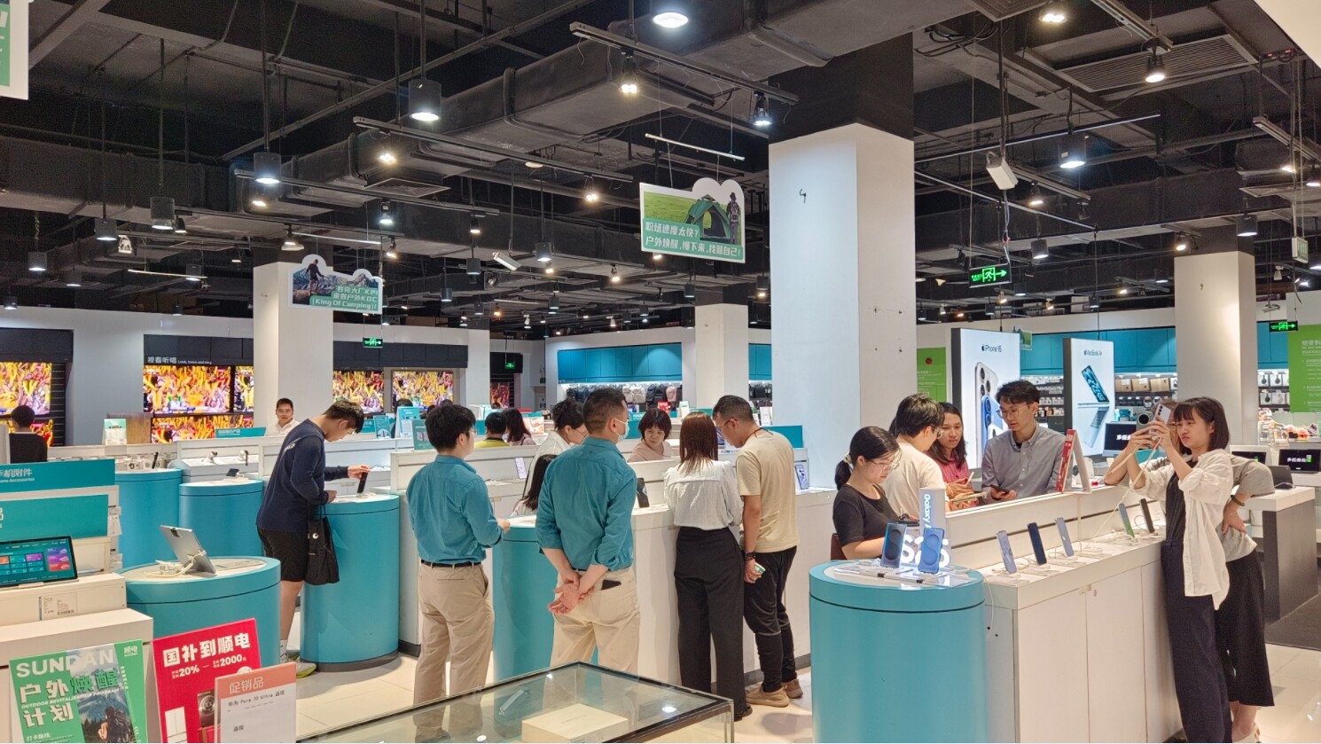 手機(jī)賣場(chǎng)擺出國(guó)補(bǔ)宣傳展板吸引消費(fèi)者。