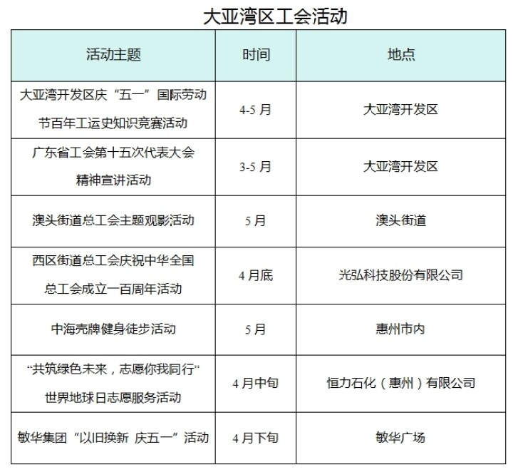 市級層面,市總工會(huì)精心策劃了多項(xiàng)活動(dòng)——慶祝“五一”國際勞動(dòng)節(jié)大會(huì)(4月底)將表彰先進(jìn)、凝聚共識;職工文藝匯演(4月底)以藝術(shù)形式展現(xiàn)百年工運(yùn)風(fēng)采;職工演講比賽(4~5月)打造“過去-現(xiàn)在-未來”三大時(shí)空對話,回首工會(huì)百年歷程;勞模工匠風(fēng)采暨職工攝影展(5月中旬)旨在展示我市各行各業(yè)勞模工匠風(fēng)采,大力弘揚(yáng)勞模精神、勞動(dòng)精神、工匠精神,發(fā)現(xiàn)勞動(dòng)之美、生活之美、惠州之美;萬名職工游南昆山、羅浮山(6月底)串聯(lián)惠州生態(tài)美景,倡導(dǎo)健康生活。