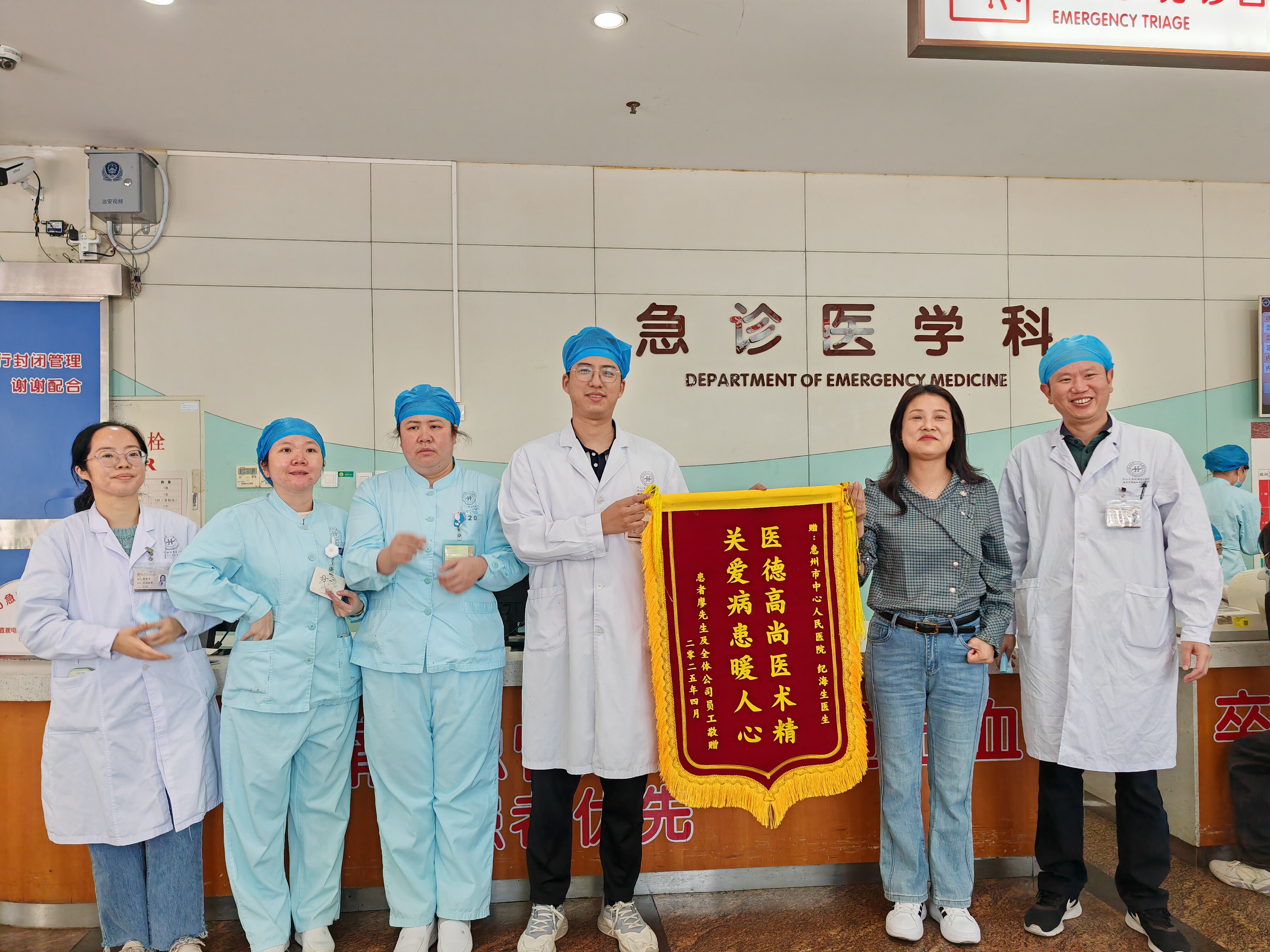 “您好,有什么能幫到您嗎?”“我們是來(lái)送錦旗的!”4月14日上午,惠州市中心人民醫(yī)院急診醫(yī)學(xué)科醫(yī)生紀(jì)海生正在診室內(nèi)忙著給病人看病,卻偶遇了溫馨而驚喜的一幕:一位患者家屬特意送來(lái)致謝錦旗,上書“醫(yī)德高尚醫(yī)術(shù)精 關(guān)愛(ài)病患暖人心”。