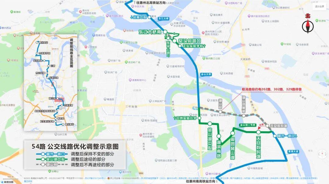 起訖點(diǎn)為惠州南高鐵站與惠州北高鐵站,服務(wù)時間為06:30-20:30 ,調(diào)整后票價為分段收費(fèi)(起步2元,全程7元)。調(diào)整后的54路將進(jìn)一步覆蓋天安數(shù)碼城、第一中學(xué)附屬金山湖學(xué)校、金山湖中心等區(qū)域,更好地服務(wù)沿線居民和學(xué)生群體。