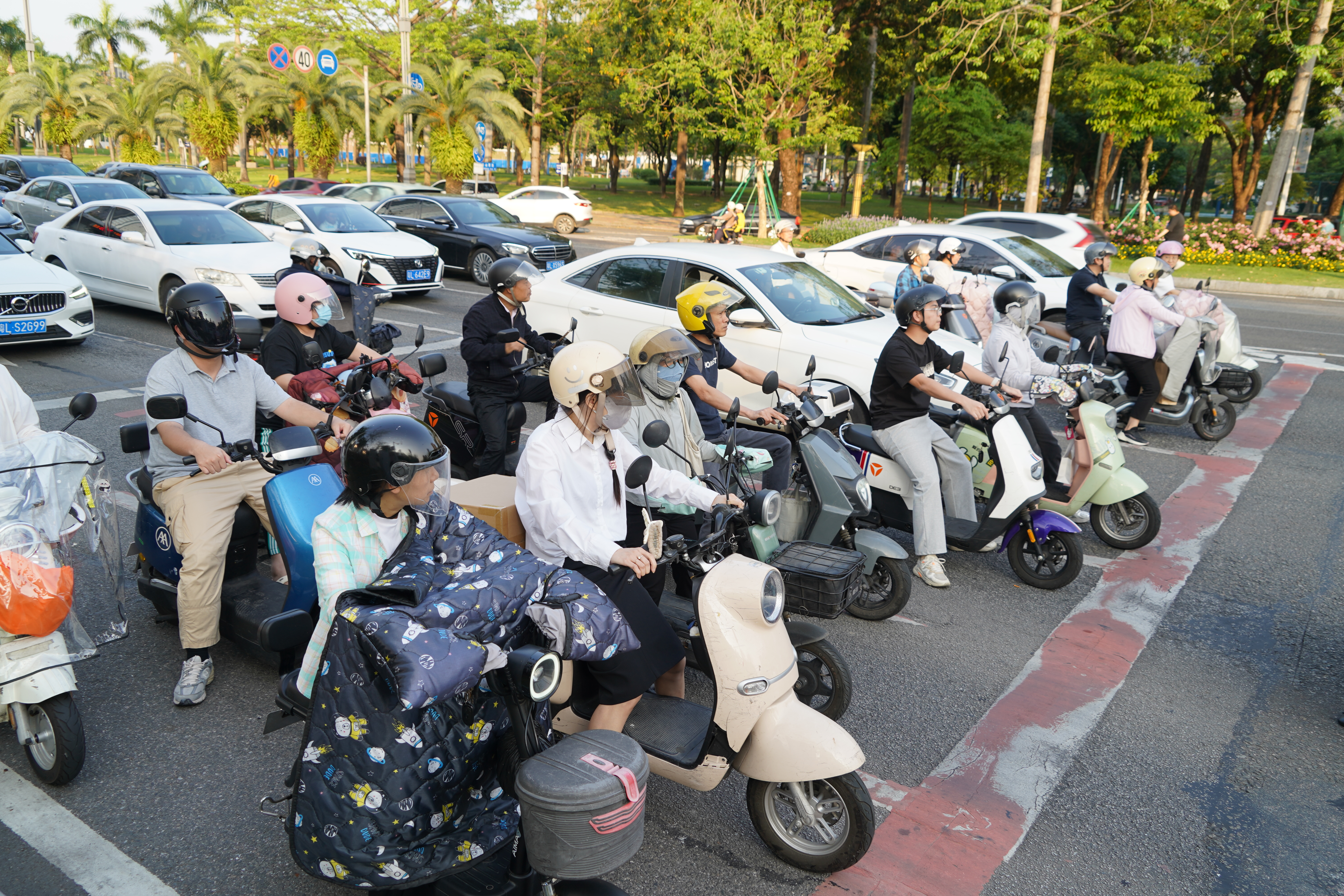 駕駛電動自行車的市民在紅燈前有序等待。惠州日報記者李松權(quán) 攝