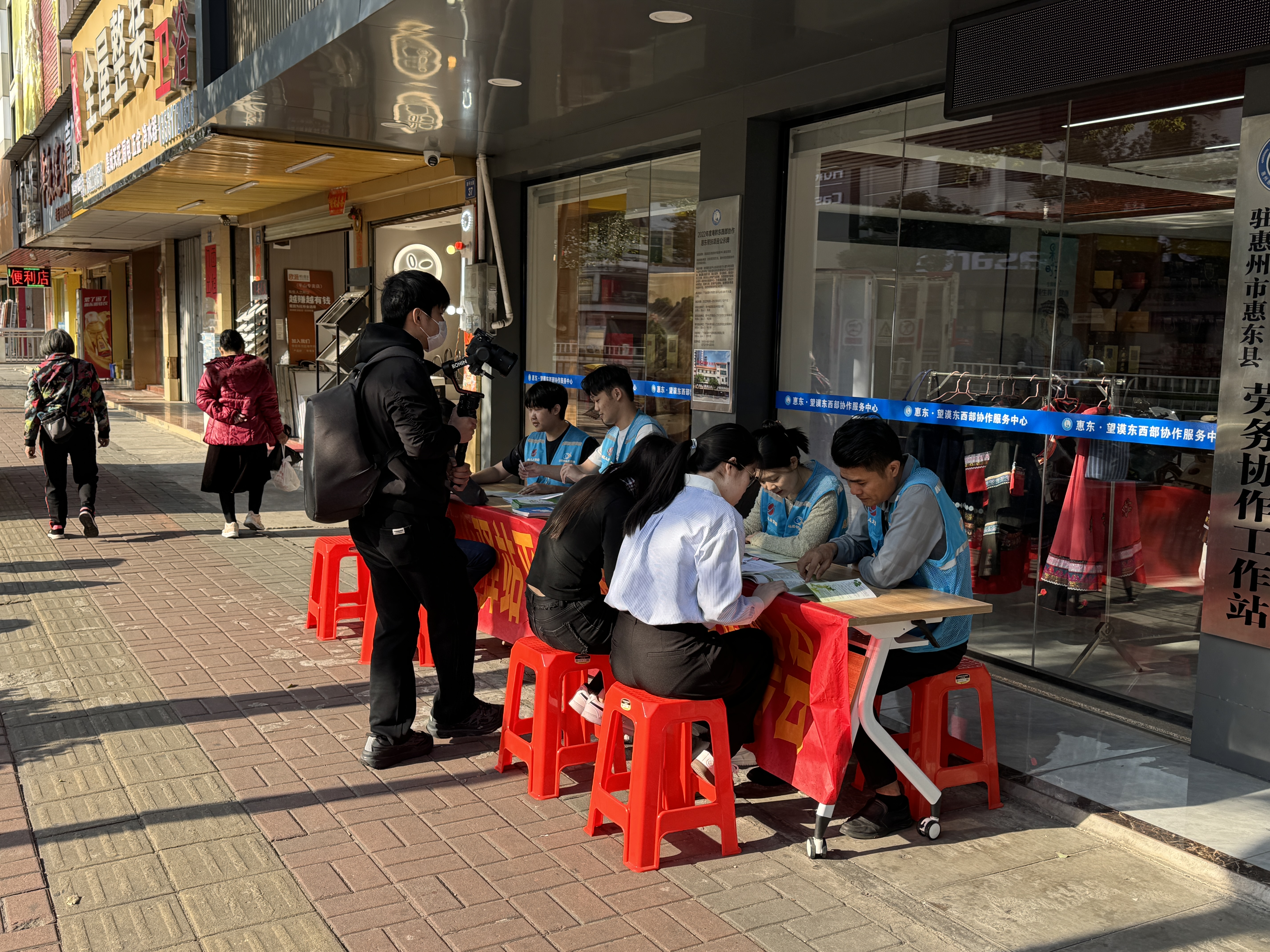惠東縣平山街道就業(yè)驛站擺攤為求職者提供就業(yè)服務(wù)。圖片由平山街道就業(yè)驛站提供