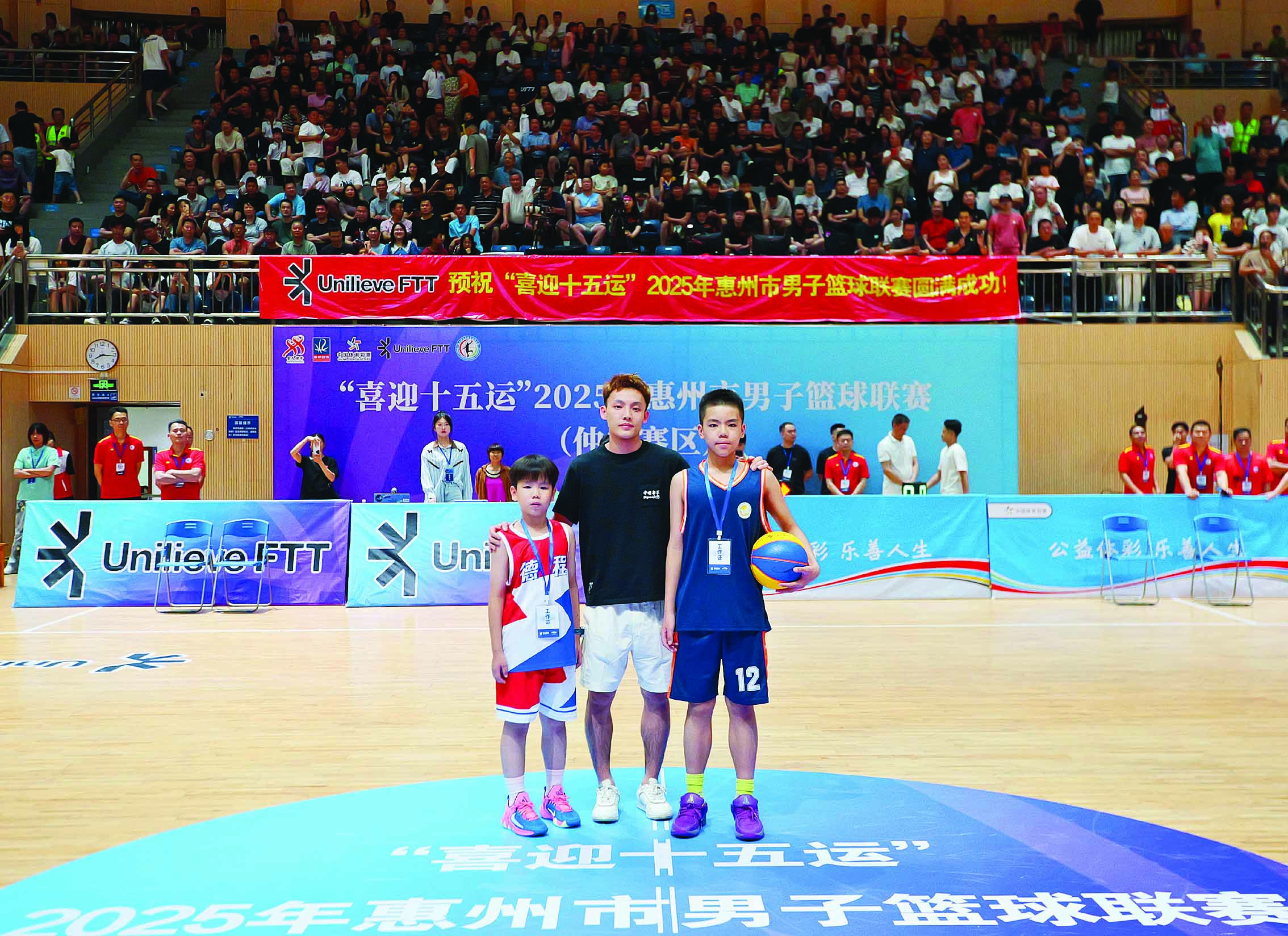比賽現(xiàn)場,徐杰和兩位籃球愛好者小朋友合照。惠州日報(bào)記者黃鑫威 攝