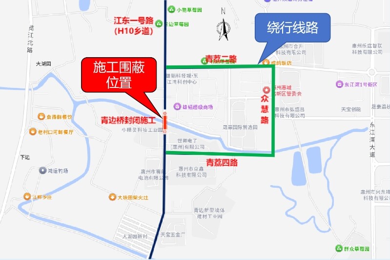 5月22日,惠州市公安局交警支隊(duì)發(fā)布《關(guān)于江東一號(hào)路青邊橋施工期間實(shí)施臨時(shí)交通管制的通告》。5月24日至施工結(jié)束(共約60天),惠城區(qū)江東一號(hào)路青邊橋禁止車(chē)輛(含非機(jī)動(dòng)車(chē))及行人通行。