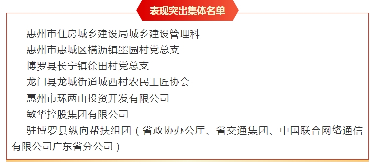 其中,惠州7個集體上榜表現(xiàn)突出集體名單,8位個人上榜表現(xiàn)突出個人名單。