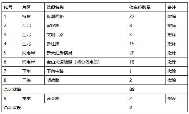 市區(qū)長湖西路等路段路內停車位調整明細表