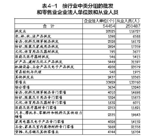 在批發(fā)和零售業(yè)企業(yè)法人單位中,批發(fā)業(yè)占37.7%,零售業(yè)占62.3%。在批發(fā)和零售業(yè)企業(yè)法人單位從業(yè)人員中,批發(fā)業(yè)占46.6%,零售業(yè)占53.4%(詳見表4-1)。