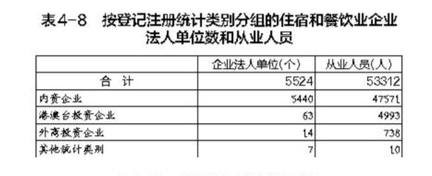 在住宿和餐飲業(yè)企業(yè)法人單位從業(yè)人員中,內(nèi)資企業(yè)占89.2%,港澳臺投資企業(yè)占9.4%,外商投資企業(yè)占1.4%(詳見表4-8)。
