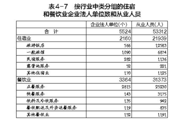 2023年末,全市共有住宿和餐飲業(yè)企業(yè)法人單位5524個,從業(yè)人員53312人,分別比2018年末增長125.3%和51.3%。