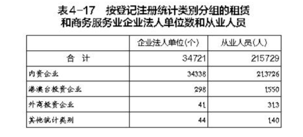 在租賃和商務(wù)服務(wù)業(yè)企業(yè)法人單位中,內(nèi)資企業(yè)占98.9%,港澳臺投資企業(yè)占0.9%,外商投資企業(yè)占0.1%。