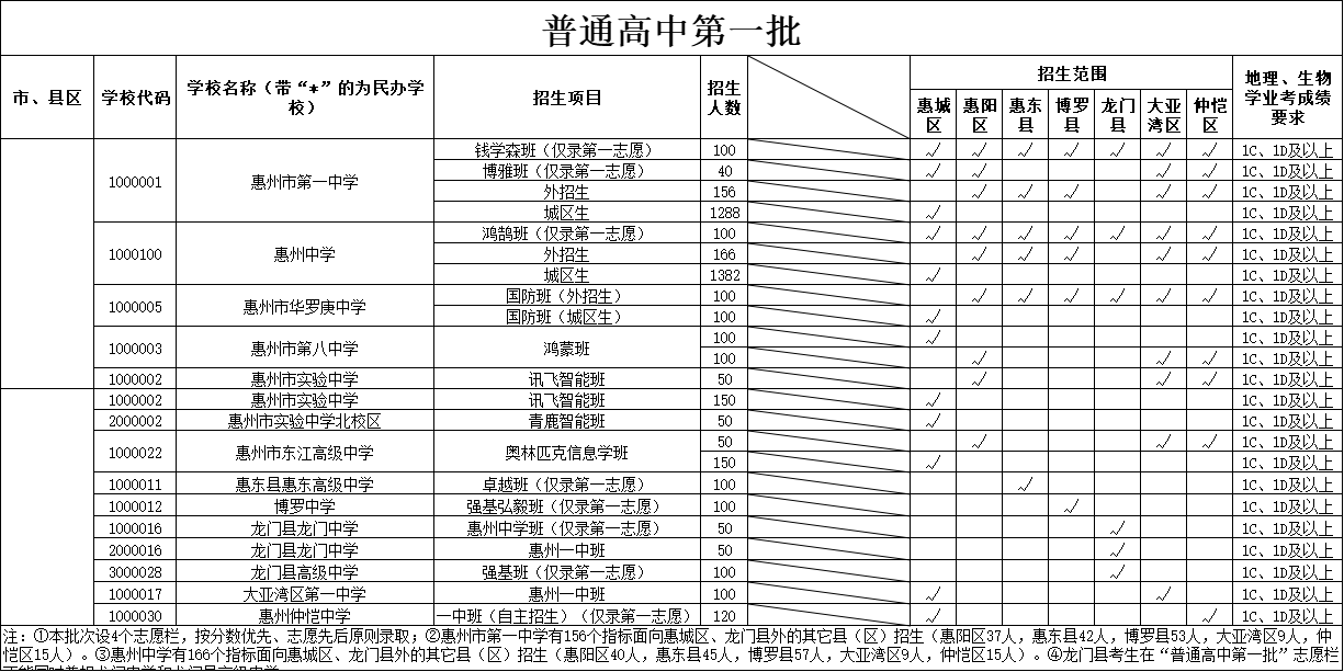 根據(jù)計劃表,今年新增加的惠州市第一中學(xué)江北校區(qū)在普通高中第二批,面向惠城區(qū)招生536人。新增的龍門縣第三中學(xué)在普通高中第二批,面向龍門招300人。新增的私立高中惠陽南嶺高級中學(xué)在普通高中第二批,面向惠陽區(qū)招收270名公費生,面向惠城區(qū)、惠陽區(qū)、大亞灣區(qū)、仲愷區(qū)招收1180名民辦收費生。