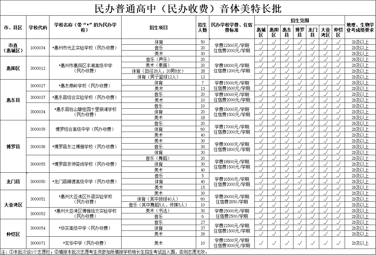 根據(jù)有關(guān)文件要求,今年惠州市將繼續(xù)貫徹落實國家和省有關(guān)屬地招生和公民同招等政策要求,在第二批招生的惠州市知行學(xué)校、惠州市綜合高級中學(xué)、惠州市光正實驗學(xué)校、惠州市正弘實驗學(xué)校等市直民辦普通高中學(xué)校主要面向四個區(qū)(惠城區(qū)、惠陽區(qū)、大亞灣區(qū)、仲愷區(qū))招生,各縣民辦普通高中學(xué)校主要面向本縣域招生。沒有完成招生計劃的民辦普通高中學(xué)校,在補(bǔ)錄志愿時,可面向全市進(jìn)行補(bǔ)錄。