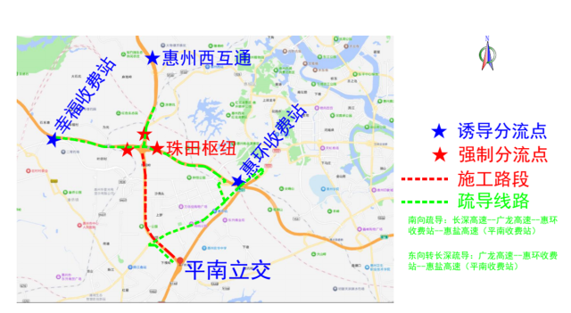 交通管制期間,長深高速河源往深圳方向車輛可通過珠田立交繞行廣龍高速、武深高速通行;長深高速河源往平南方向車輛可從惠州西互通駛出高速繞行惠新大道通行;廣龍高速往長深高速深圳方向車輛可繞行武深高速通行;廣龍高速往平南方向車輛可通過惠環(huán)收費(fèi)站、幸福收費(fèi)站駛出高速繞行地方道路通行。