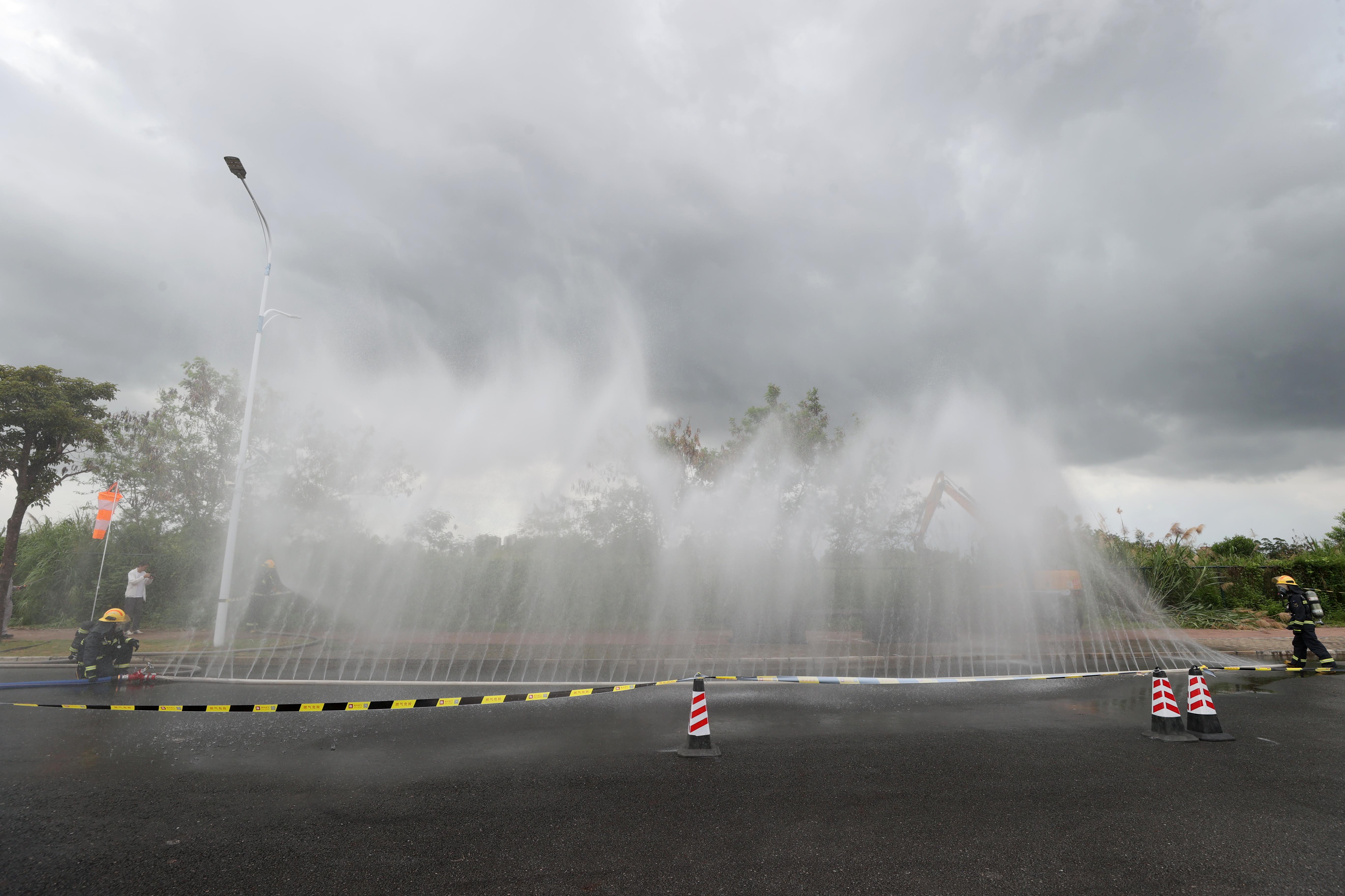 消防員到場,用水霧驅(qū)散燃?xì)獗Wo現(xiàn)場作業(yè)。惠州日報記者楊建業(yè) 攝
