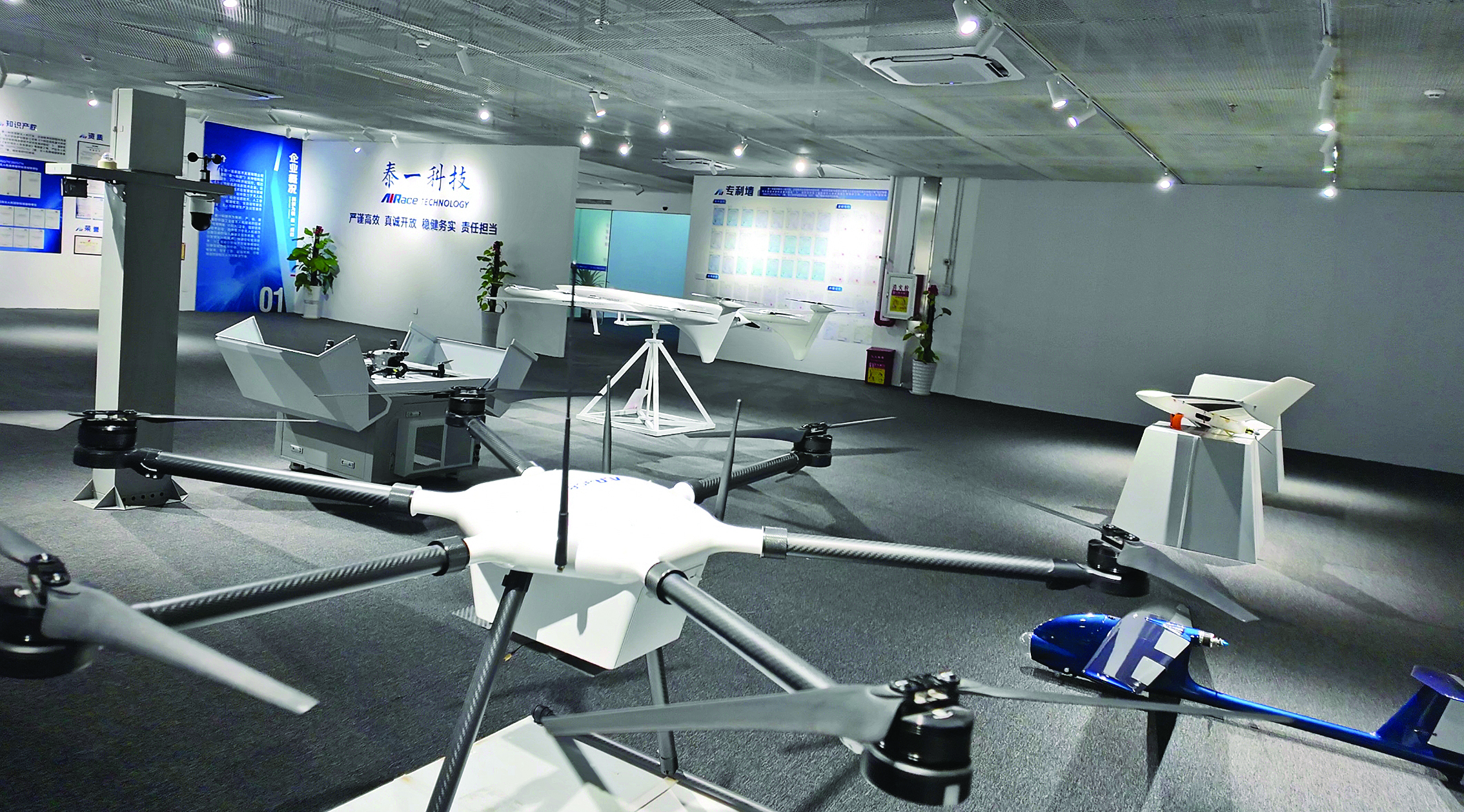廣東泰一高新技術(shù)發(fā)展有限公司展廳內(nèi)的無(wú)人機(jī)。惠州東江圖片社供圖