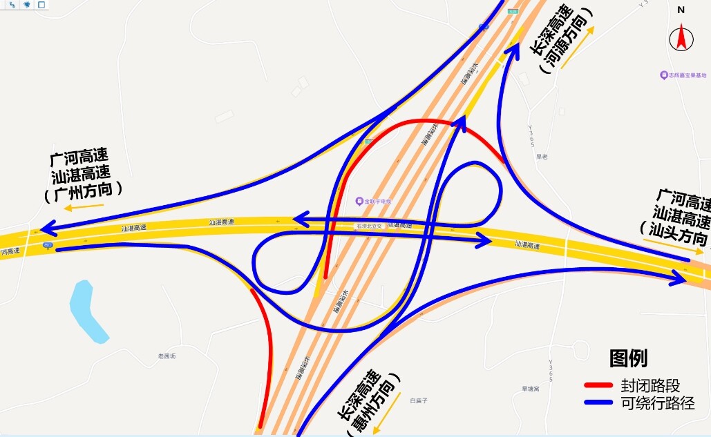 長深高速施工封閉及繞行示意圖。圖片來源惠州交警