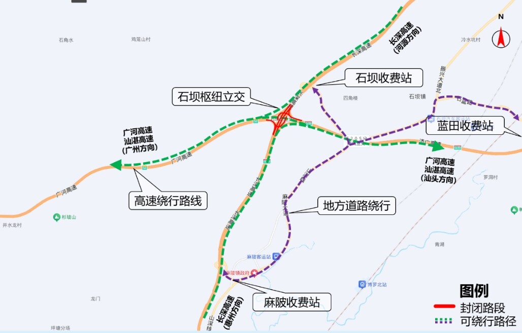 惠州交警建議,惠州往河源方向(北行)過境車輛,經(jīng)石壩北樞紐立交繞行惠龍高速、廣河高速、濟(jì)廣高速,廣龍高速行駛;河源往惠州方向(南行)過境車輛,經(jīng)石壩北樞紐立交繞行廣河高速,惠龍高速、濟(jì)廣高速、武深高速行駛;廣河高速、汕湛高速往長深高速惠州、河源方向的車輛,請繞行公莊收費(fèi)站、藍(lán)田收費(fèi)站、古竹收費(fèi)站下高速繞行地方道路通行。地方道路惠州往河源方向車輛,可提前通過楊村或麻陂收費(fèi)站駛離高速,繞行G205國道。