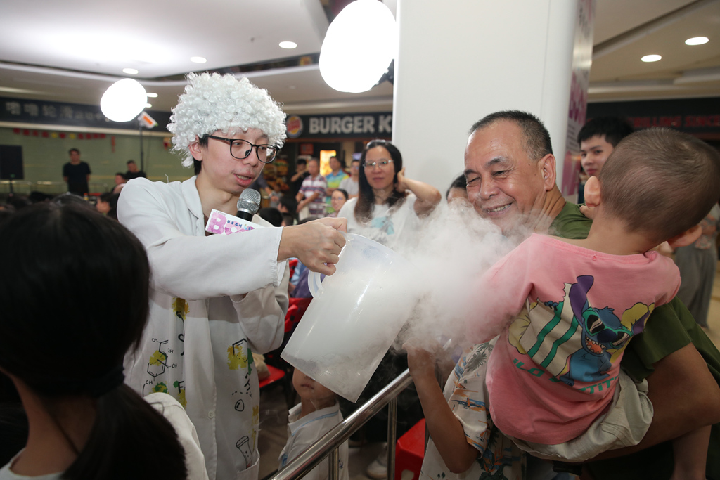當晚的活動中,米吳團隊通過趣味問答、實驗游戲等形式與孩子們互動,還不時邀請家長們上臺配合。現(xiàn)場氛圍熱烈,在一陣陣歡笑與驚嘆聲中,孩子們輕松掌握了河流蜿蜒的成因、壓強的基本概念等知識。