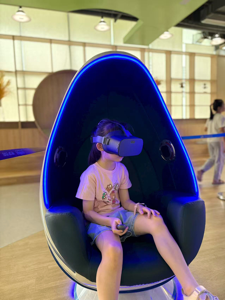 VR蛋殼椅為深度體驗活動,受到青少年追捧,其核心亮點在于獨特的“蛋殼椅”體驗艙。這些設(shè)計前衛(wèi)、符合人體工學(xué)的蛋殼形座椅,為參與者提供了極致的舒適與包裹感,有效隔絕外界干擾。當(dāng)你坐進蛋殼椅,戴上VR設(shè)備的那一刻,仿佛進入了一個專屬于你的“故事穿梭艙”。經(jīng)典名著中那些令人神往的場景,奇幻的、歷史的、科幻的世界將以360度全景、逼真可交互的形式在眼前生動展開。