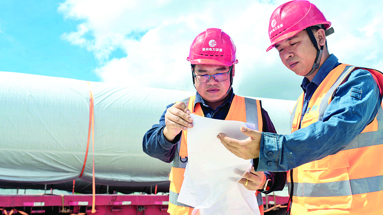 惠州市電力發(fā)展有限公司旗下廣東惠電投綜合能源服務(wù)有限公司的工作人員在三門島碼頭清點(diǎn)驗(yàn)收剛運(yùn)抵的風(fēng)機(jī)設(shè)備。