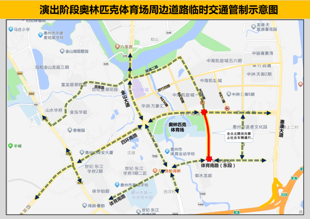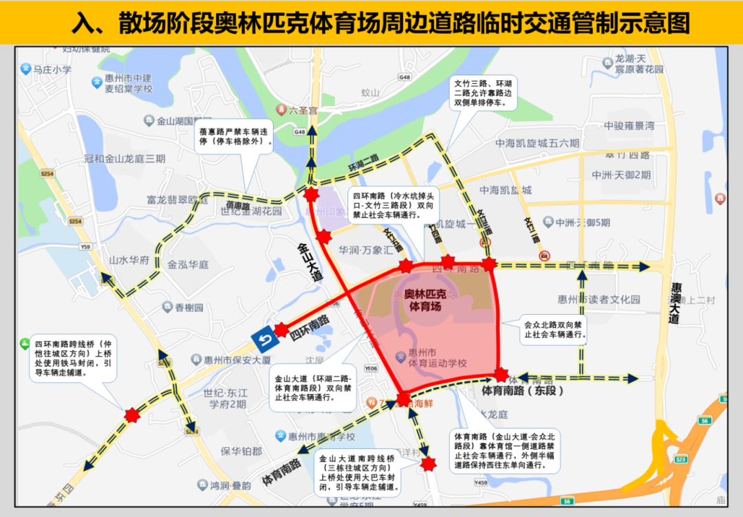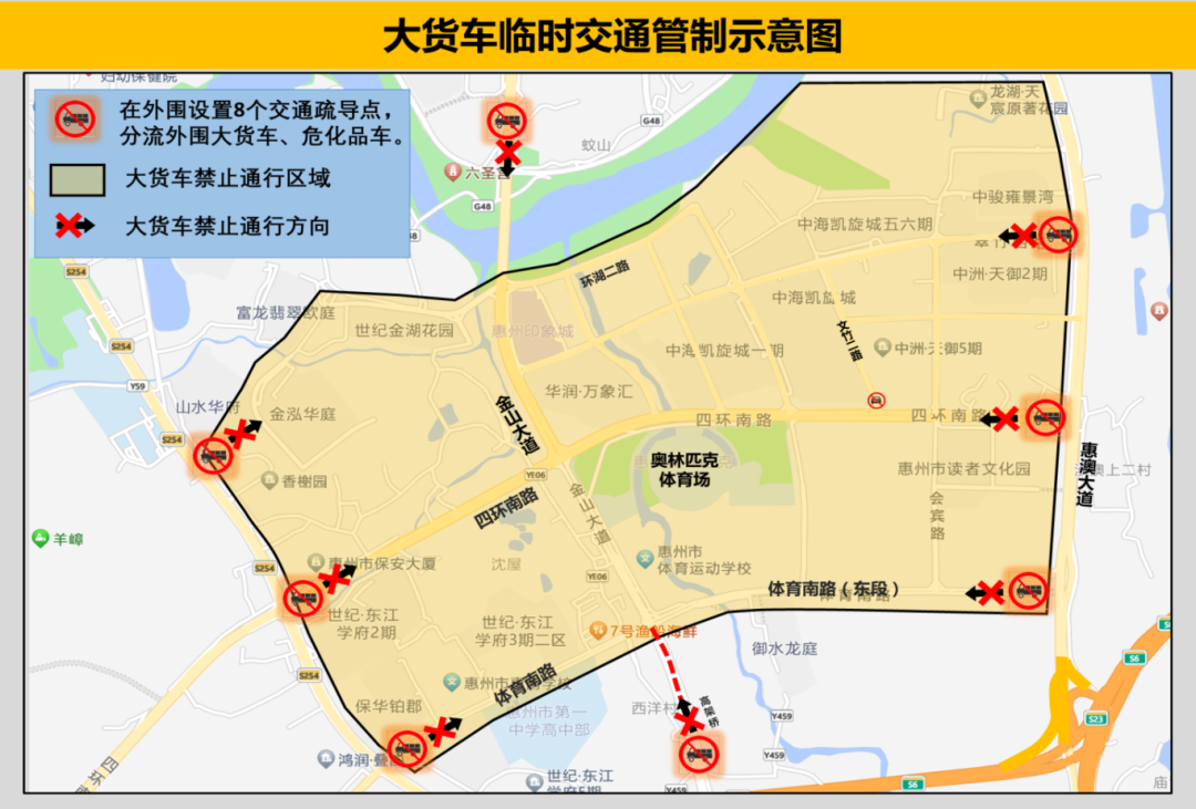 惠州奧林匹克體育場周邊環(huán)湖二路、蓓惠路、演達(dá)大道、惠澳大道、體育南路合圍區(qū)域,禁止核載4.5噸以上貨車、危險(xiǎn)化學(xué)品運(yùn)輸車輛通行。