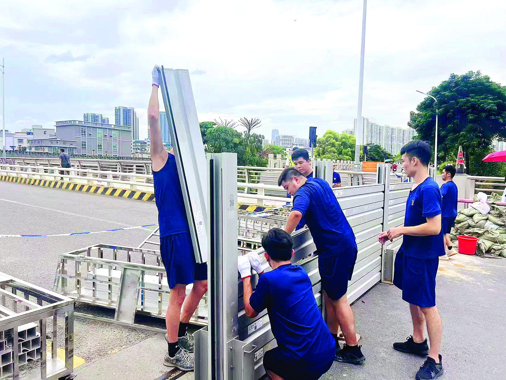 惠陽區(qū)全力做好淡水鐵橋的防風(fēng)防洪工作。9月23日中午,惠陽區(qū)發(fā)布《關(guān)于淡水鐵橋?qū)嵤┡R時交通管制的通知》,當(dāng)天13時對淡水鐵橋?qū)嵤┓忾]管制,禁止機動車、非機動車、行人通行。惠陽區(qū)應(yīng)急救援大隊運送防汛物資奔赴淡水鐵橋,在鐵橋兩側(cè)安裝可移動式的防洪插板,防止淡水河水位上漲引起的河水倒灌。