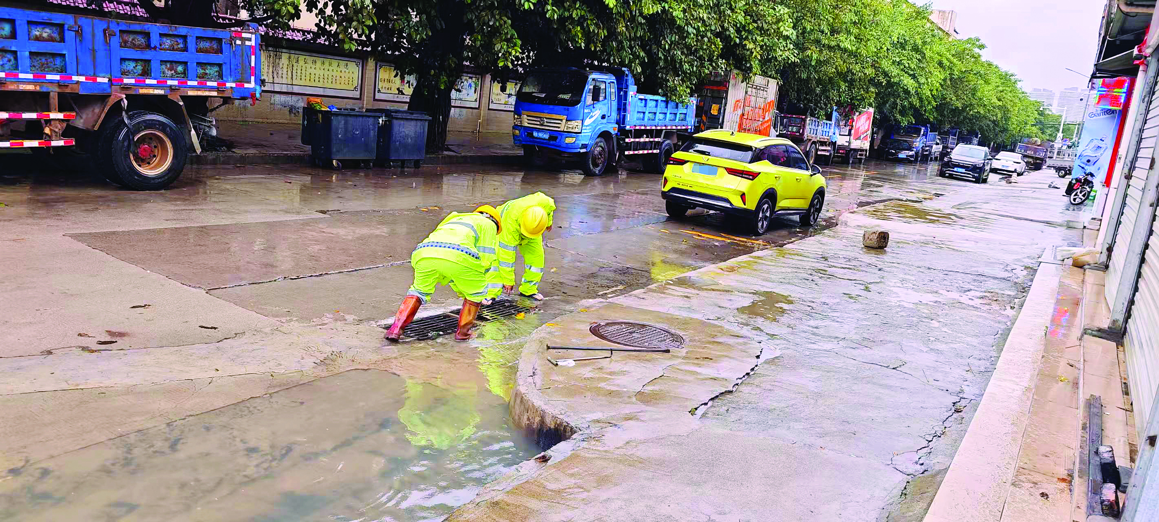 排澇人員及時疏排積水。惠州日報記者謝菁菁 特約通訊員黎華容 通訊員陳巧梅 攝
