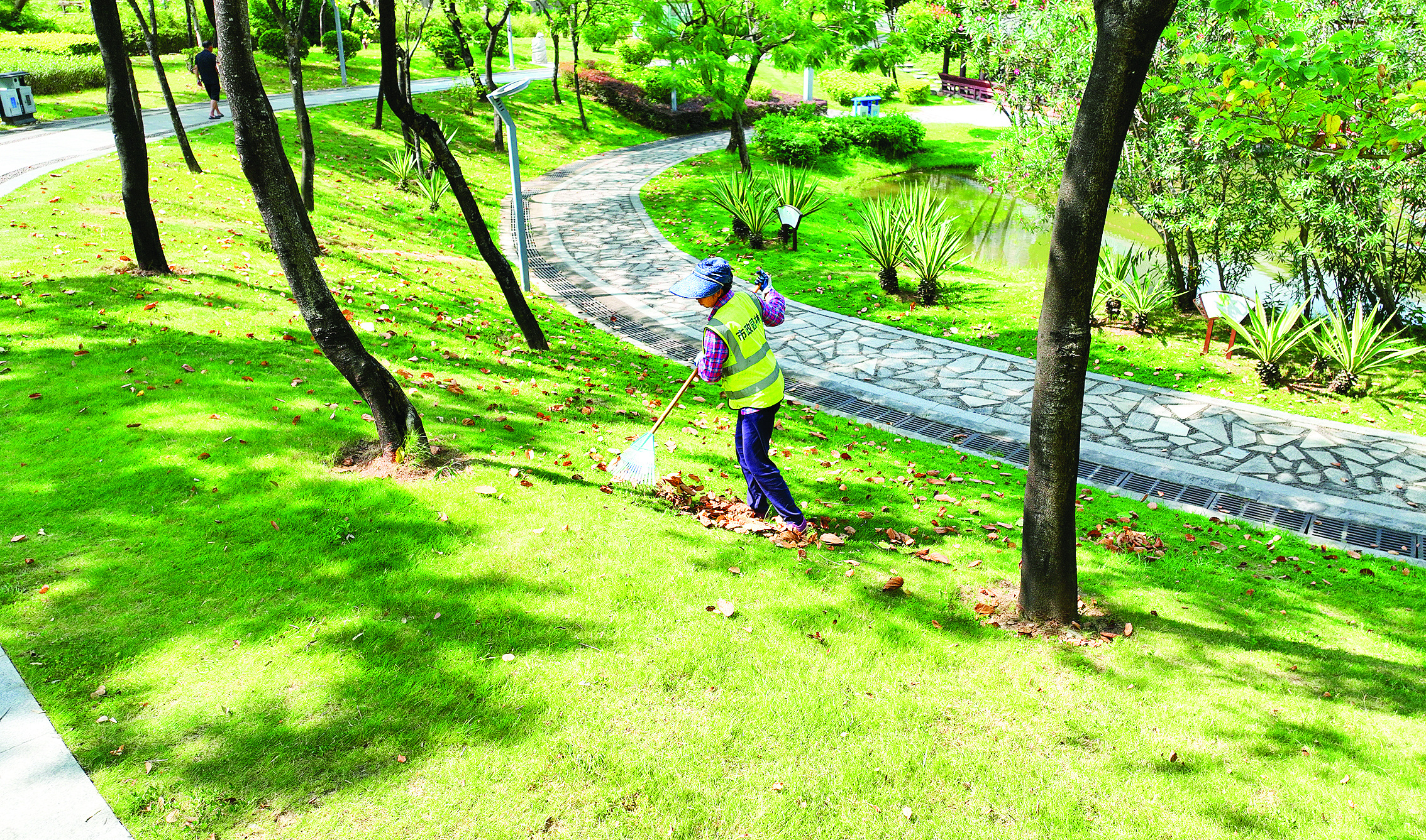 在新湖公園,工人在清掃綠化垃圾。
