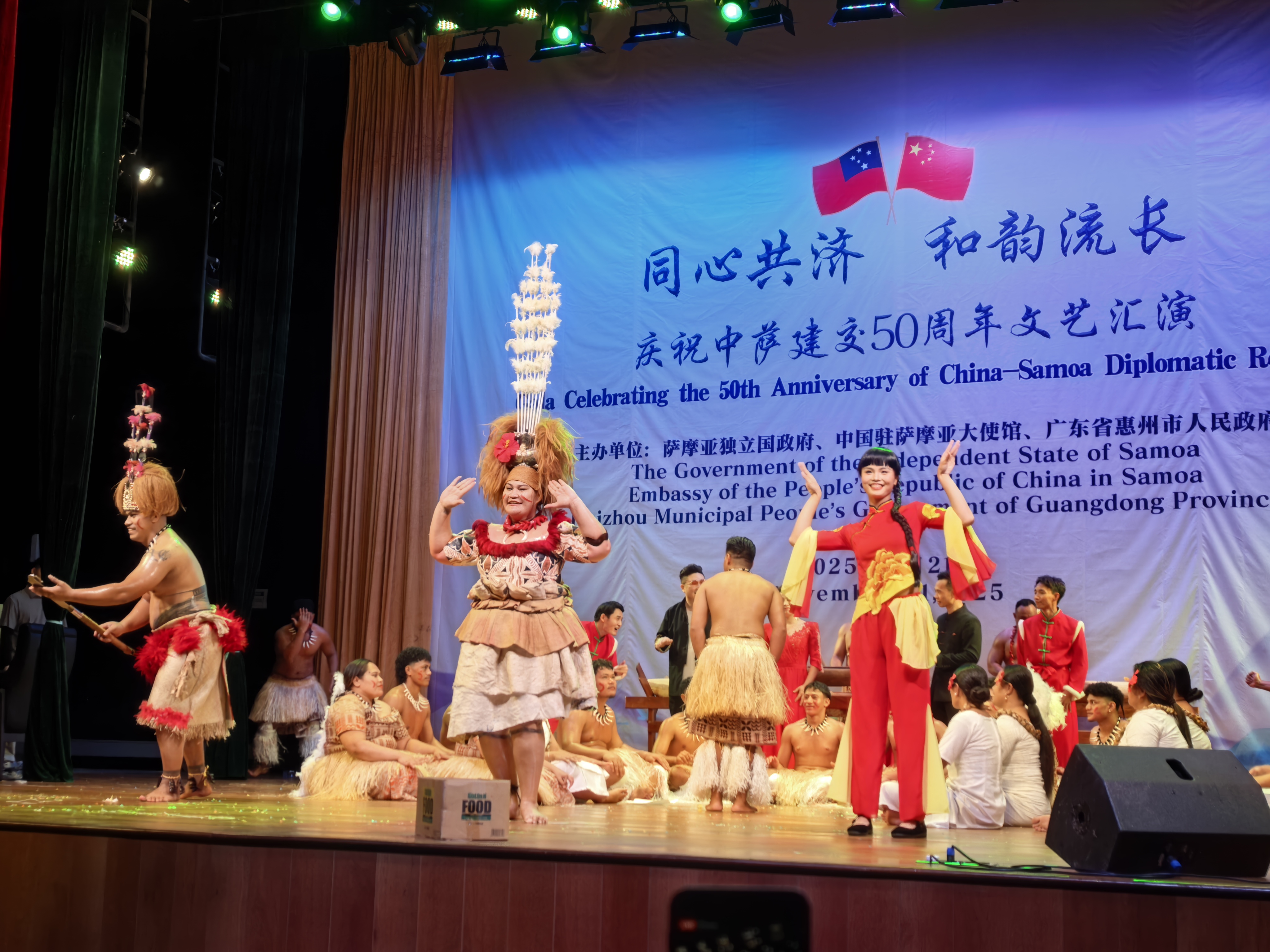 11月21日晚,“同心共濟 和韻流長”慶祝中薩建交50周年文藝匯演在薩摩亞文化藝術(shù)中心舉行。本次匯演由薩摩亞政府、中國駐薩大使館、惠州市政府聯(lián)合舉辦。