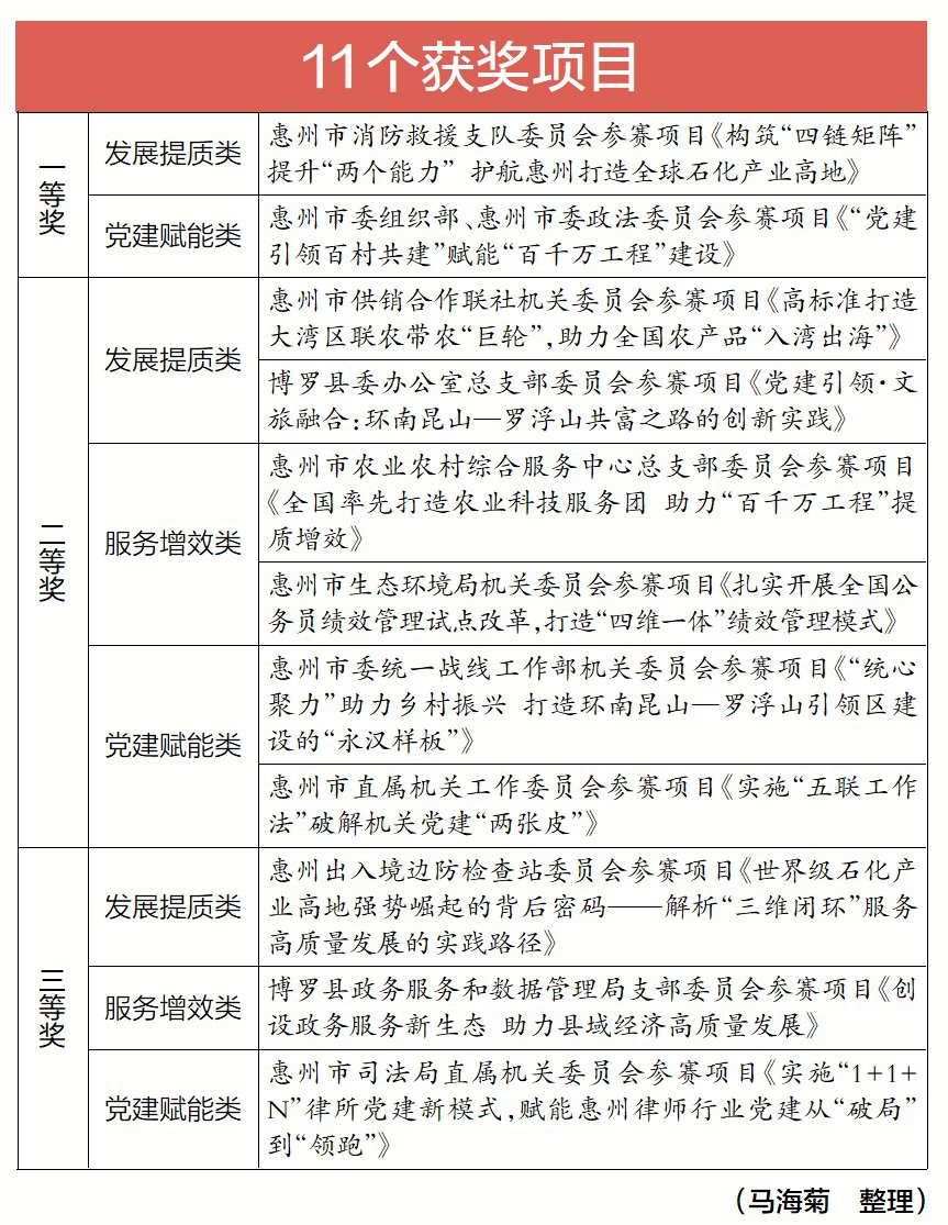 惠州在大賽中取得優(yōu)異的成績,充分體現(xiàn)了全市各級黨組織堅持以高質量黨建引領高質量發(fā)展、以創(chuàng)新思維破解發(fā)展難題的堅定決心與務實作風。一個個創(chuàng)新項目的背后,是黨建與業(yè)務深度融合的堅強保障,是黨員干部攻堅克難的擔當作為,彰顯了惠州在新時代新征程上奮勇爭先、開拓創(chuàng)新的嶄新風貌,為助力惠州打造廣東高質量發(fā)展新增長極提供強勁動力。