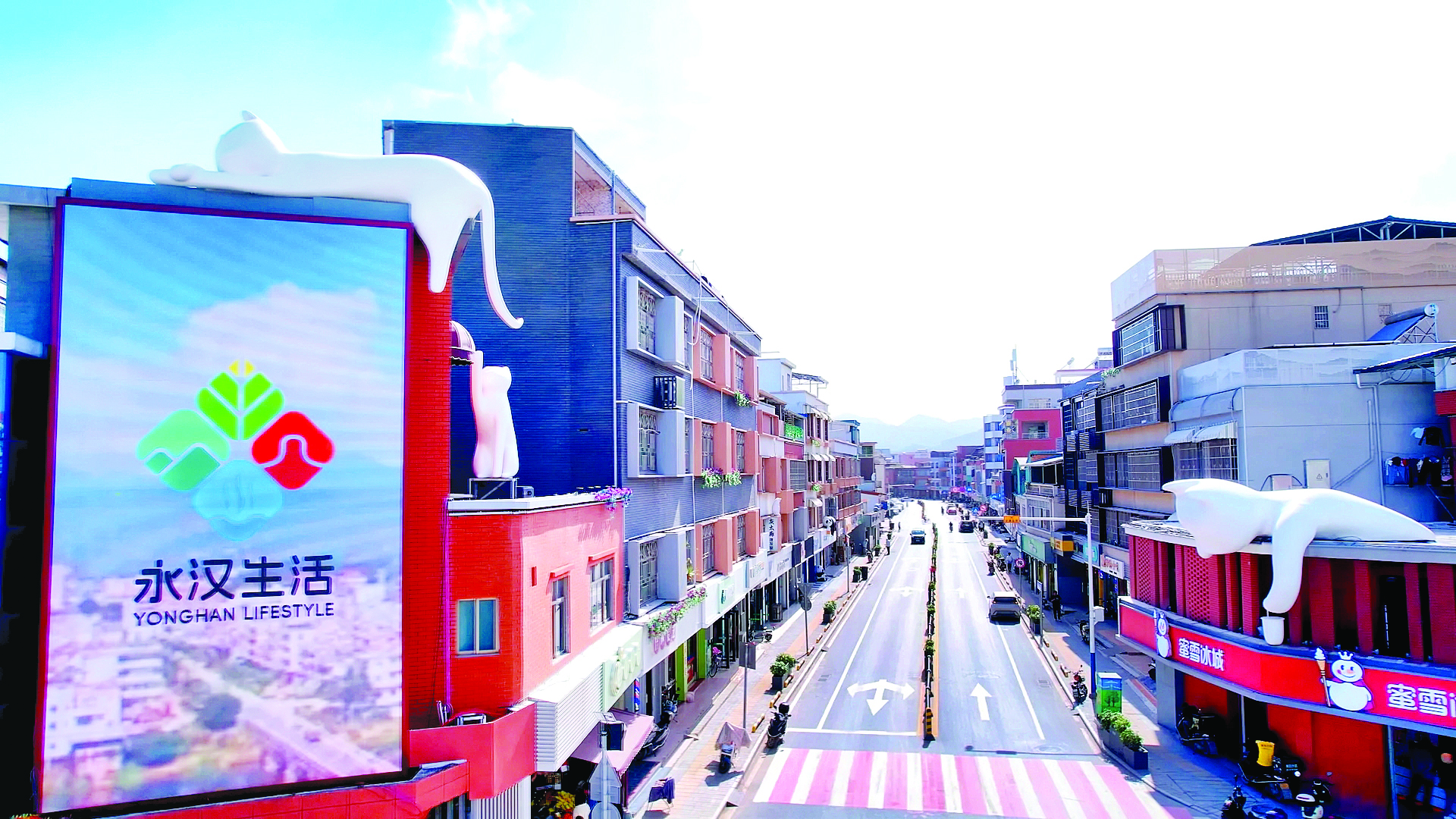 龍門縣永漢鎮(zhèn)打造豹貓IP形象,將其融入街頭店鋪房頂,讓圩鎮(zhèn)別有一番趣味。惠州東江圖片社供圖