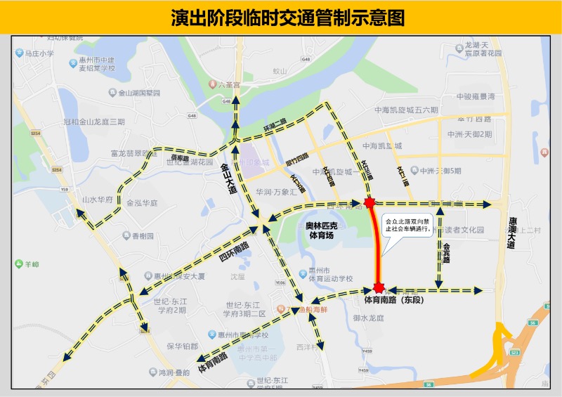 入、散場階段管制時間為12月20日18:45至19:30,以及21:00至22:15。期間,金山大道(環(huán)湖二路-體育南路段)雙向禁止社會車輛通行。四環(huán)南路(冷水坑掉頭口-文竹三路段)雙向禁止社會車輛通行。體育南路(金山大道-會眾北路段)東往西方向禁止社會車輛通行。會眾北路雙向禁止社會車輛通行。