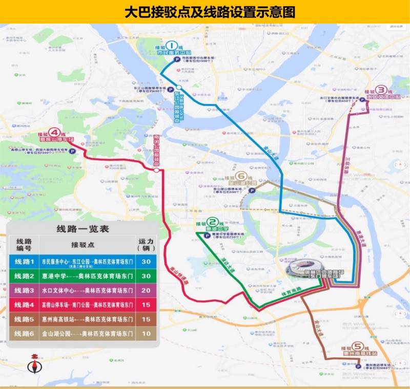 演唱會當天,市區(qū)設置6條大巴車接駁線路。其中,線路1為江北街道市民服務中心、東江公園停車場(文昌二路公交站)往返奧林匹克體育場東門;線路2:為南岸街道惠港中學停車場往返奧林匹克體育場東門;線路3為水口街道文化體育中心停車場往返奧林匹克體育場東門;線路4為龍豐街道高榜山停車場、南門公園往返奧林匹克體育場東門;線路5為三棟鎮(zhèn)惠州南高鐵站(文思一路)往返奧林匹克體育場東門;線路6為河南岸街道金山湖公園停車場往返奧林匹克體育場東門。