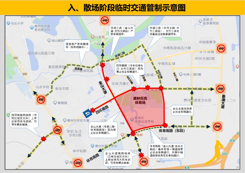 惠州公安交管部門提醒,請前往惠州奧林匹克體育場的觀眾盡量選擇大巴車接駁出行,到就近的接駁點換乘大巴往返。請途經(jīng)車輛提前規(guī)劃好行車線路,避開上述交通管制路段出行,以免交通擁堵。