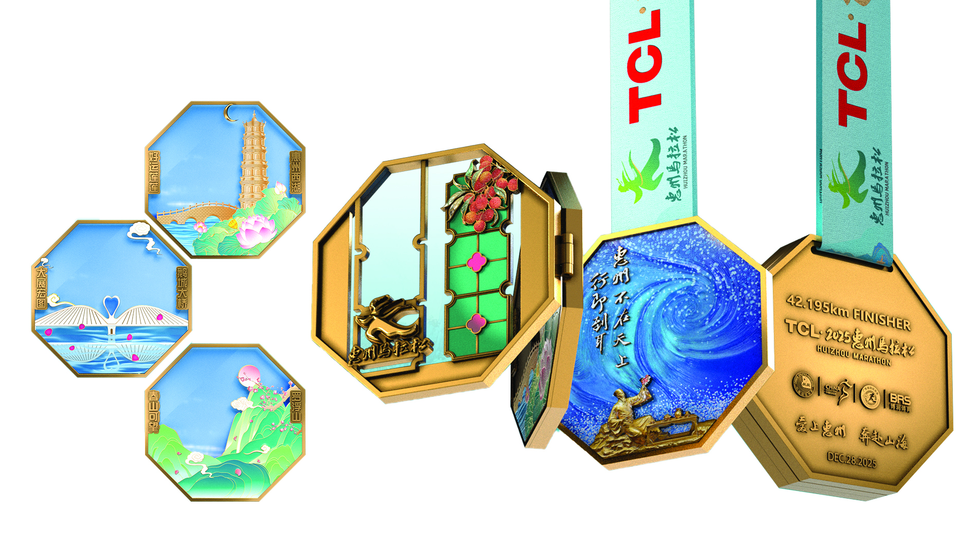 這份千年的文化基因,被深度編織進賽事的每一個細節(jié)。本屆賽事繼續(xù)以“暢跑山海惠州,盡享東坡文化”為主題,以“惠州不在天上,行即到耳”為口號,視覺形象和精神內(nèi)核全面浸潤東坡風雅。參賽服取意“紫氣東來”,上面奔跑的東坡形象和他最愛用的“呵呵”二字,仿佛在告訴每一位跑者:人生緣何不快樂?且學東坡灑脫奔跑。完賽獎牌則如同一份精致的嶺南禮物:延續(xù)三折疊設計,創(chuàng)新融入幸運盲盒,內(nèi)含三款可拆卸冰箱貼,分別以“大展宏圖”的鵝城大橋、“好事蓮蓮”的惠州西湖和“春山可望”的羅浮山為造型,寓意跑者“跑過山海,所愿皆達”。
