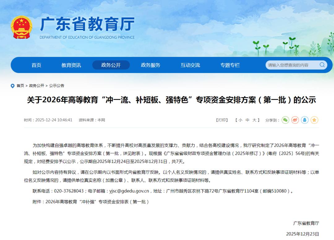 據(jù)公示消息,為加快構(gòu)建自強(qiáng)卓越的高等教育體系,不斷提升高校對高質(zhì)量發(fā)展的支撐力、貢獻(xiàn)力,結(jié)合各高校建設(shè)情況,廣東省教育廳研究制定了2026年高等教育“沖一流、補(bǔ)短板、強(qiáng)特色”專項(xiàng)資金安排方案(第一批,詳見附表)。現(xiàn)根據(jù)《廣東省省級財(cái)政專項(xiàng)資金管理辦法(2025年修訂)》(粵府〔2025〕56號)的有關(guān)規(guī)定,對經(jīng)費(fèi)安排予以公示,公示期自2025年12月24日至2025年12月31日,共7天。