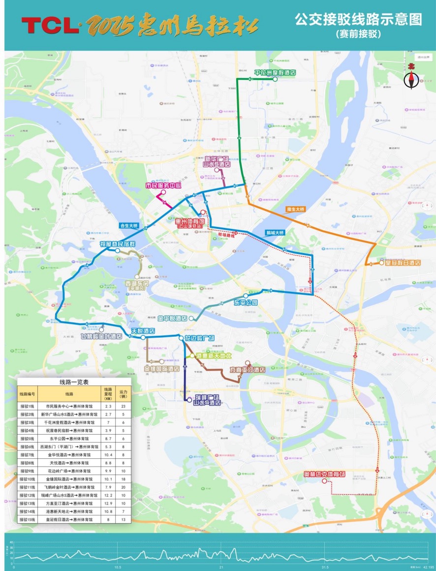 公交接駁措施方面,12月28日賽事當(dāng)天5時(shí)30分至6時(shí)30分,在市區(qū)江北、江南、橋東、橋西、龍豐、河南岸、水口七個(gè)片區(qū)設(shè)置15條公交接駁專線(車輛貼有統(tǒng)一標(biāo)識(shí)),中途不停靠,一站直達(dá)起點(diǎn)惠州體育館(云山城軌站)。