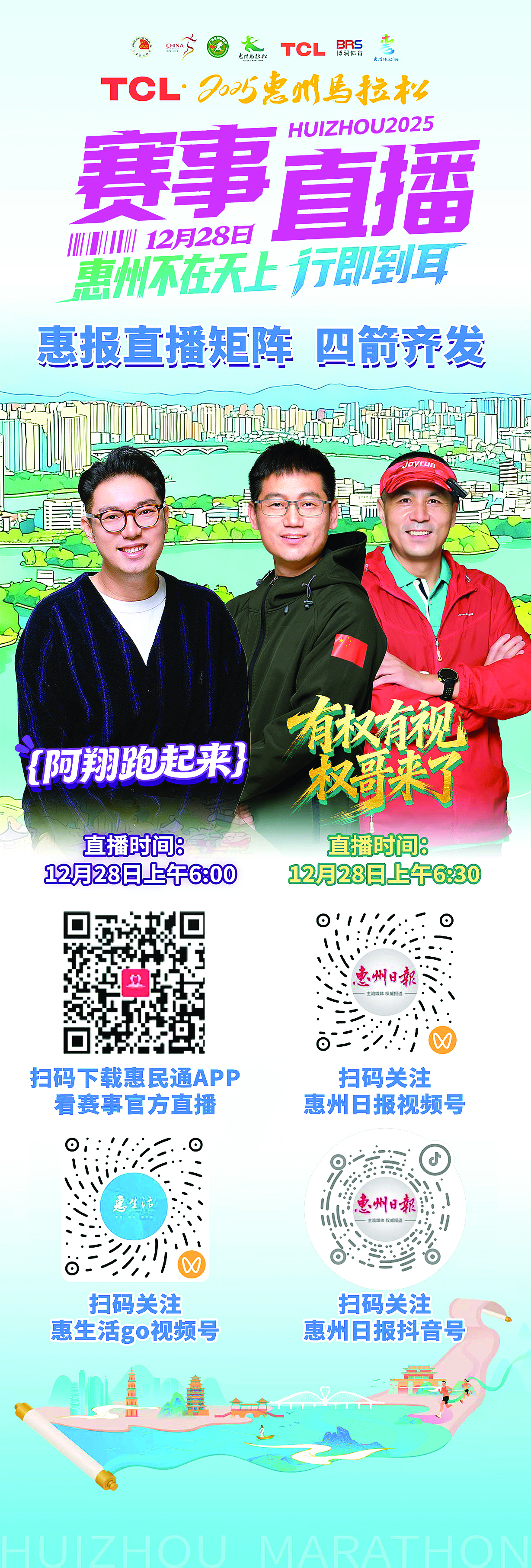 本次直播矩陣包括:惠州日?qǐng)?bào)社旗下“惠州惠民通”APP將實(shí)時(shí)轉(zhuǎn)播賽事官方信號(hào),提供權(quán)威賽事全景;在微信視頻號(hào)及抖音平臺(tái),由本報(bào)記者、“有權(quán)有視”欄目主播李松權(quán)攜手知名跑者“百馬王子”文懿教練,以“第一視角”進(jìn)行移動(dòng)直播,直擊賽道核心動(dòng)態(tài);“惠生活go”視頻號(hào)將推出特色沉浸式直播,由本報(bào)記者、“阿翔跑起來”欄目主播,同時(shí)也是參賽跑者的黃宇翔領(lǐng)銜,代入跑者親身感受。