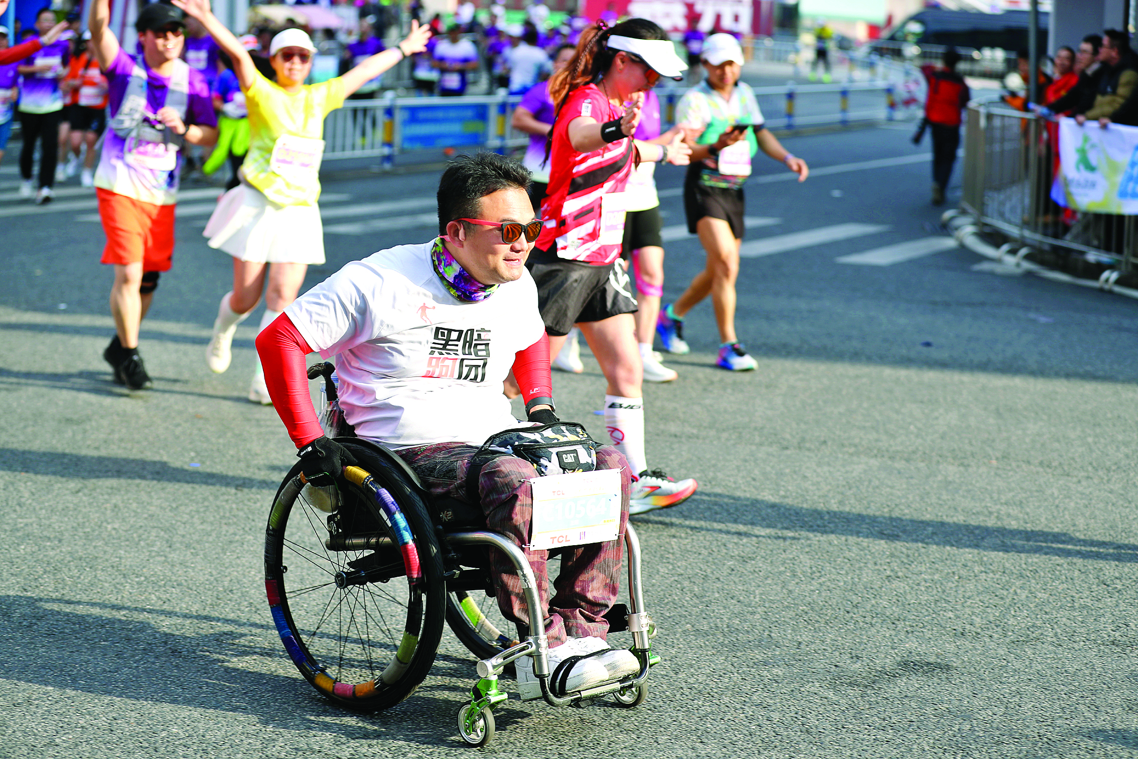 5小時(shí)21分,已沖線的葉建華劃著輪椅返回賽道,等著同樣劃輪椅準(zhǔn)備沖刺的王璟。30多秒后,兩位輪椅選手并排“劃過”終點(diǎn)線,成功完賽全馬。“這是2025年的收官之戰(zhàn),也是我們最好的禮物。”王璟開心地說道。