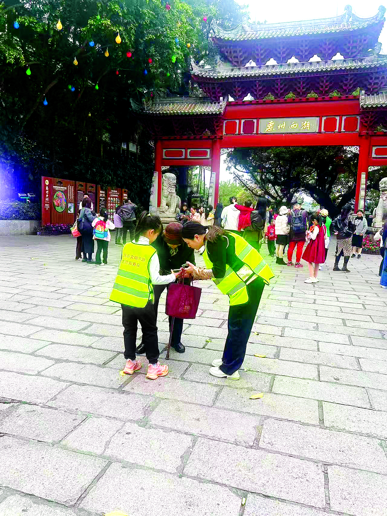 元旦假期,惠州西湖景區(qū)游人如織。1月1日上午,志愿者黃玉婷帶著孩子早早來(lái)到惠州西湖大門(mén),開(kāi)始了一天的志愿服務(wù)。“今年游客明顯比往年多,很多來(lái)自沈陽(yáng)、長(zhǎng)春、貴州的游客都很喜歡西湖,作為惠州人我也很自豪。”黃玉婷笑著告訴記者,每當(dāng)游客詢問(wèn)游玩路線,她都會(huì)熱情推薦:“游完西湖景區(qū)順著步行街一路品嘗小吃,走到水東街,然后搭乘東江游船欣賞江景。”